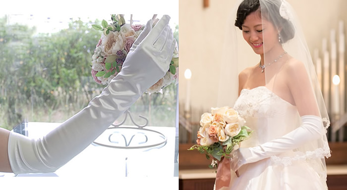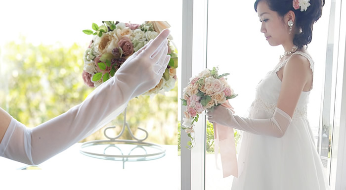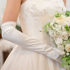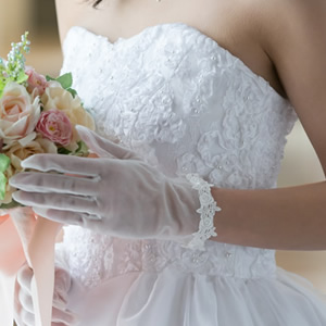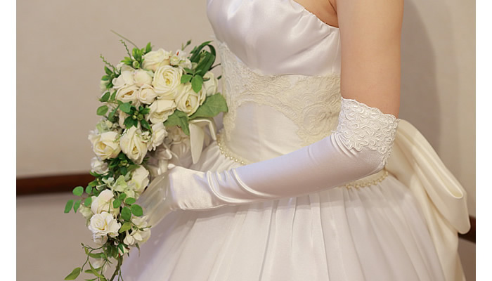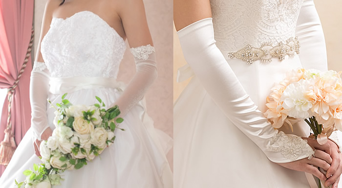 グローブには素材、長さ、デザイン等、種類がたくさんありますね。 ドレスのデザインや式場によってグローブにも相性があります。 まずはグローブの基本知識からお話します。