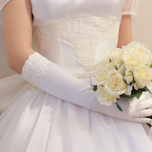 装飾の多いドレスはディティールが似たグローブに合わせると効果的です。