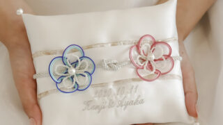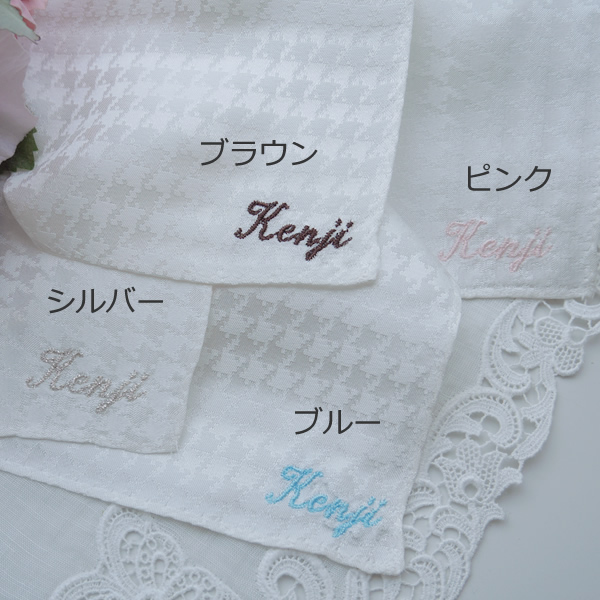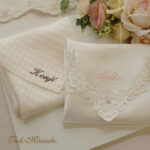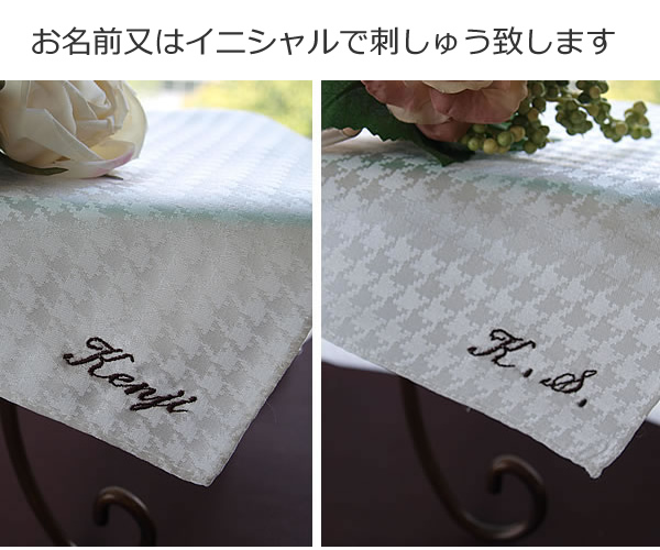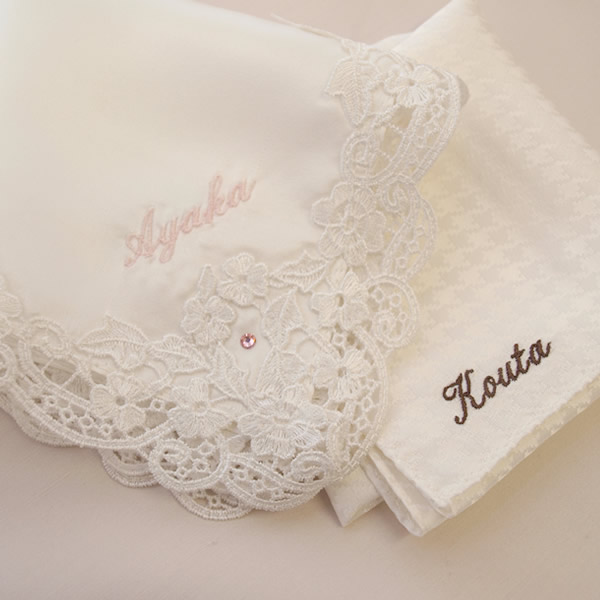 新郎新婦のお二人へのウエディングギフトにもお勧めのお名前刺繍入りハンカチ。セット価格での販売です。