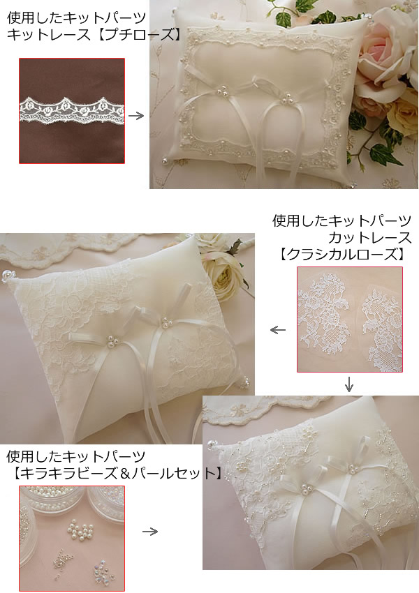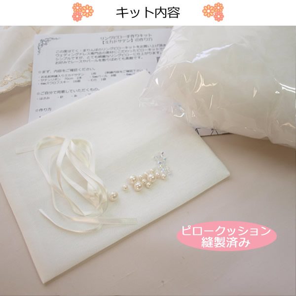 ピロークッションは縫製済みですので縫製に自身の無い方でも簡単に素敵なリングピローが作れます。