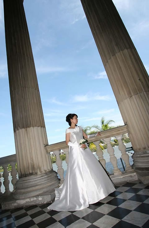 ランチレセプションも歴史ある建物で、ベールをとり、作っていただいたコサージュをつけ、髪形も少しチェンジしてとてもかっこいいバルコニーで写真をとってもらいました。