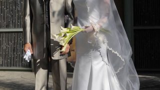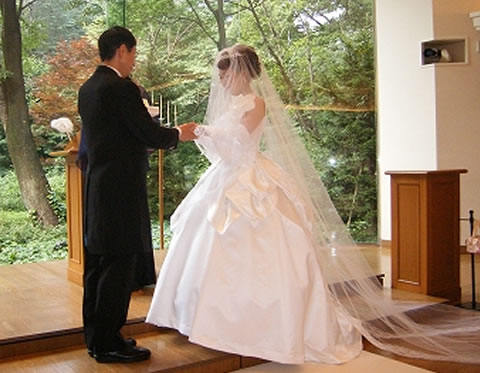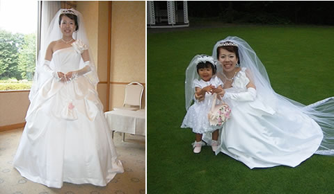 自分でも気が付かなかったのですが、結婚式直前にやせたようで、ドレスを着てみたらブカブカでした。ドレスが届いた時はピッタリだったのに・・・。それが 少し残念でしたが、やせたのは嬉しいし、介添えさんが時々ドレスを上に引っ張りあげてくれたので、何とか大丈夫でした。