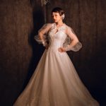 また、ロングのグローブは思い切って丈を短くしてショートグローブにし、裾の部分にバラのレースをつけました。千鳥がけで伸びるように纏り、レースは伸びないので表側だけ縫い付けて、裏側は中心にスナップボタンをつけて着脱ができるようにしました。
