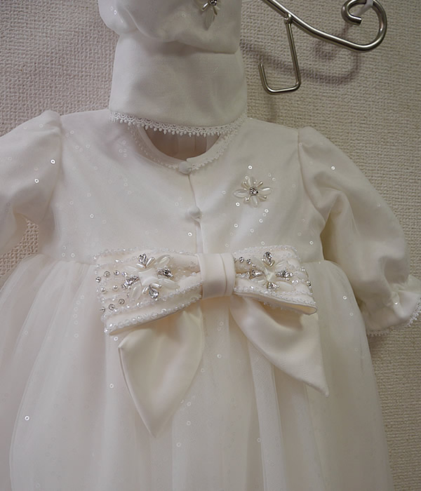 スパンコールのチュールがきらきらしてとても可愛いベビードレスに仕上がりました!