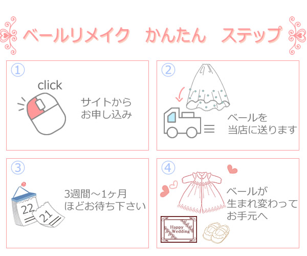 - 各商品ページから「ベールリメイク申し込み」ボタンを押してお申込みフォームにお進みください。