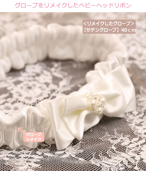お式で活躍したウェディンググローブが可愛いベビーのヘッドリボンに甦ります。