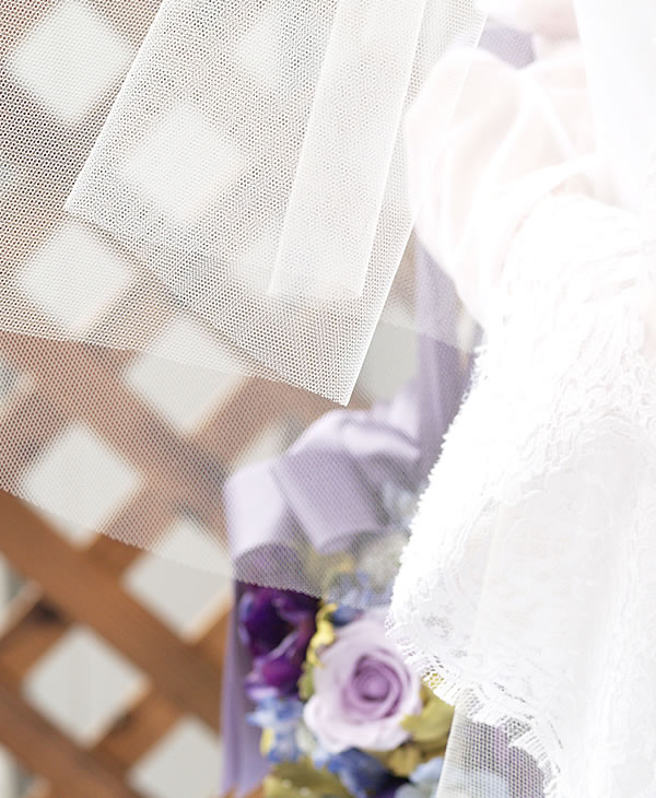 ベールの周囲はカットしたままで装飾加工の無い状態ですのでレースやビーズを施してご自分だけの”マイベール”を作りたい方にもお勧めです。
