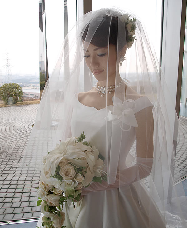 チュール素材全体に上品なシルバーラメを施したベールは、花嫁様の動きによってキラキラと光り、とてもエレガントに演出します。