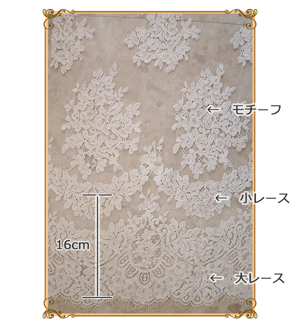 ソフトチュール(日本製の上質で柔らかな手触りです。)  リバーレース(太レース12cm~17cm幅波形 細レース3cm~6cm弓形 フランス製の最高級レースです。) コームは付いています。