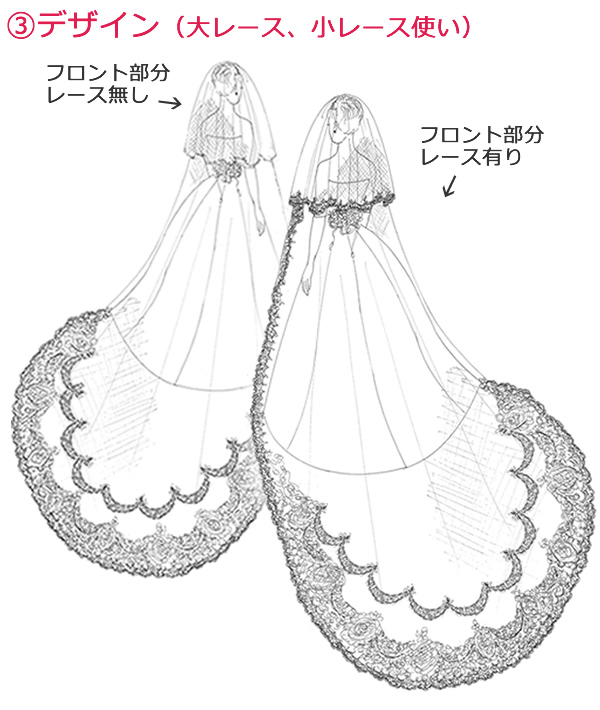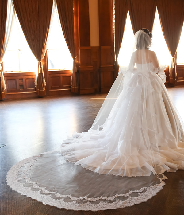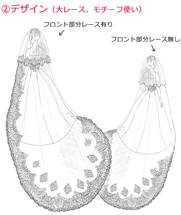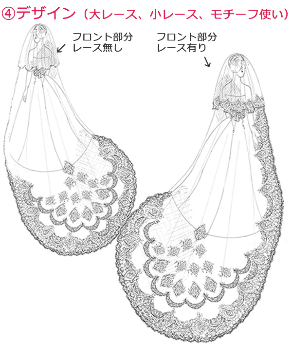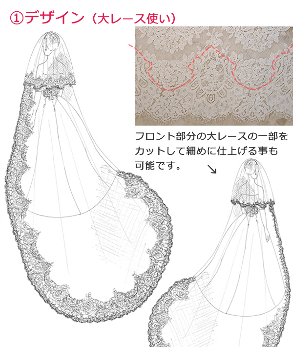レースをふんだんに使ったゴージャスな1枚。モチーフをバック中心に向かって立ち上がるようにアレンジしました。華麗なベールで最高の花嫁に。フロント部分のレースはお好みでお選び頂けます。