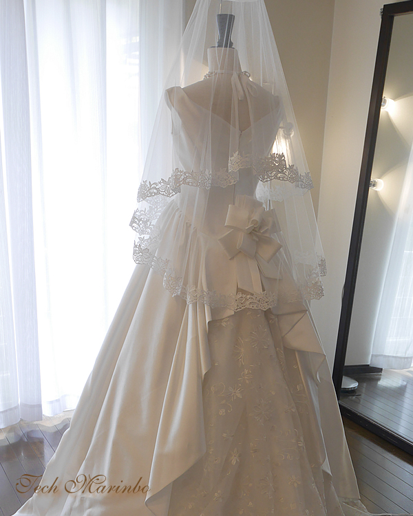 シンプルなドレスはもちろん、華やかなロングトレーンにもマッチするミディアム丈。