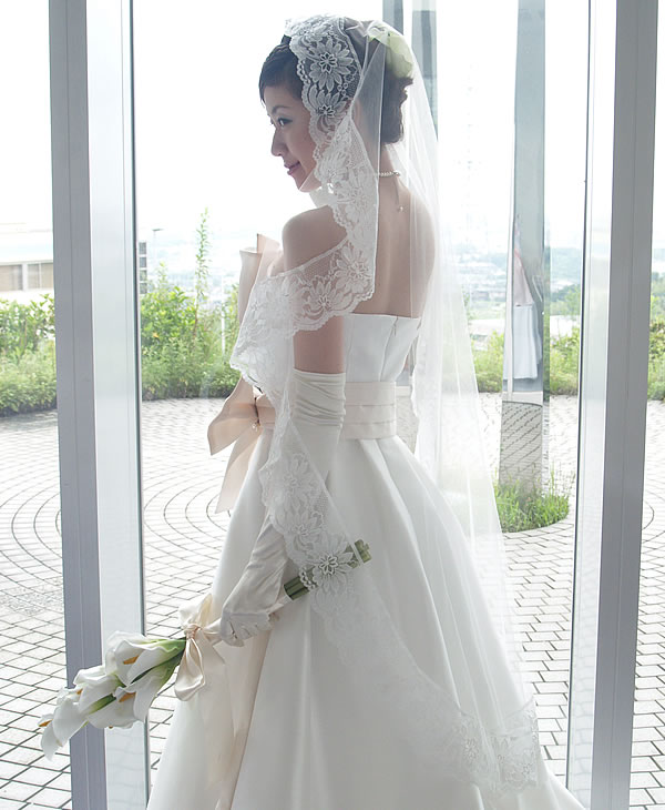 幅の太いレースですが、透明感があるので重いイメージにならず、ノーブルで存在感たっぷりのマリアベールです。