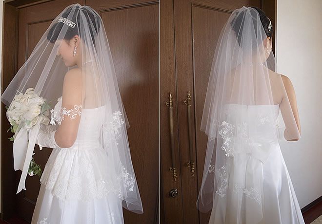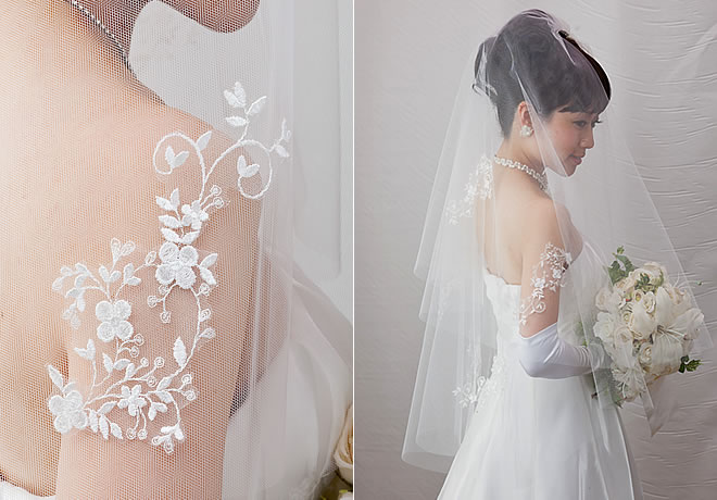 上質なソフトチュールにレースモチーフが散りばめられた、華やかで優美なウェディングベール。