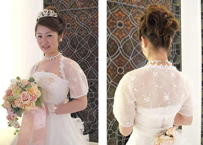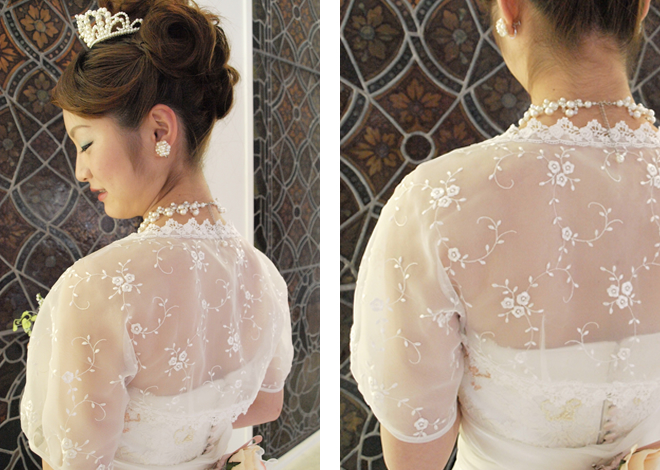 ふんわりと包み込むようなシルエットが、ドレススタイルをより華やかに演出します。お色直しやゲストのお見送りなどにもイメージを変えていただける、ミニローズ柄のボレロ。