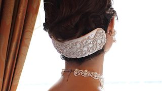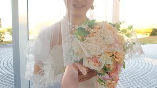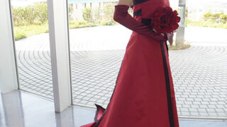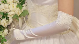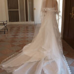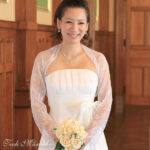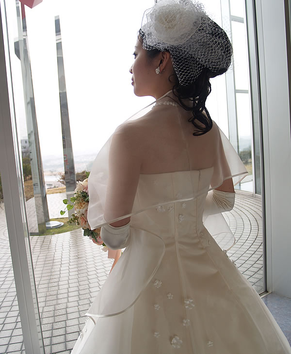 サテンのパイピングを周囲にほどこすことで、流れるようなフリルラインを表現しました。ウエディングドレスに映えて、色々なアレンジが楽しめます。