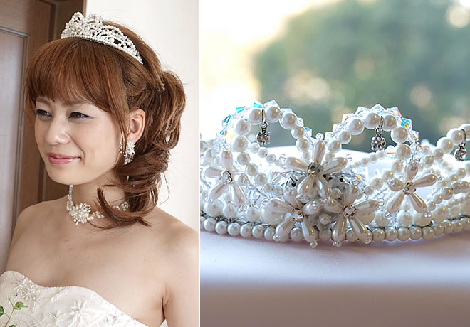 パールやスワロフスキーをふんだんに使用した華やかなボリューム感のティアラです。 幾重にもパールが重なり合って、美しい流線型をかたどっています。