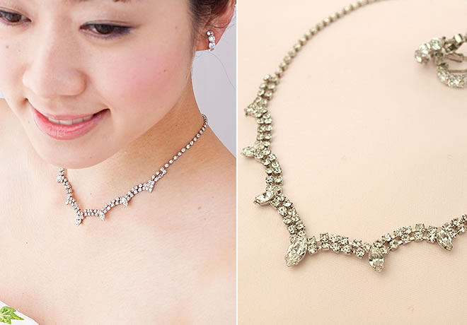 スタイリッシュなネックレスとイヤリングの組み合わせは全体の印象を引き締め、ドレス姿が際立ちます。