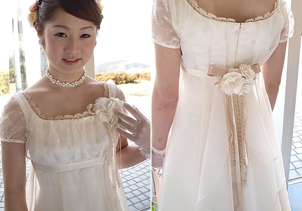 スカートにはまるでモンシロチョウが舞っているかのように薄い素材のお花を1枚1枚ほどこした、可憐でクラシカルなドレスです。