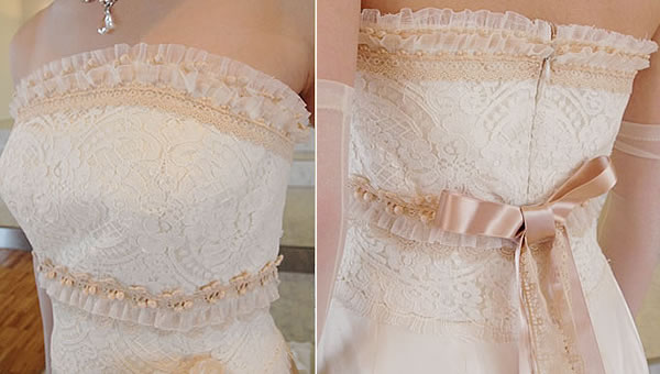 リバーレースの上に数種類のアンティークレースを重ねたクラシカルなドレスです。