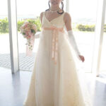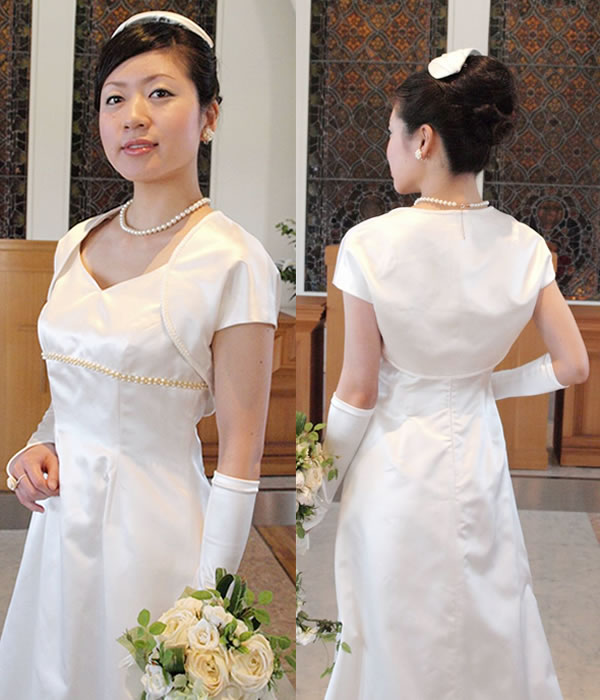 披露宴では、セットのシルクボレロを合わせて頂き、さりげない大人のチェンジを楽しんで頂けます。