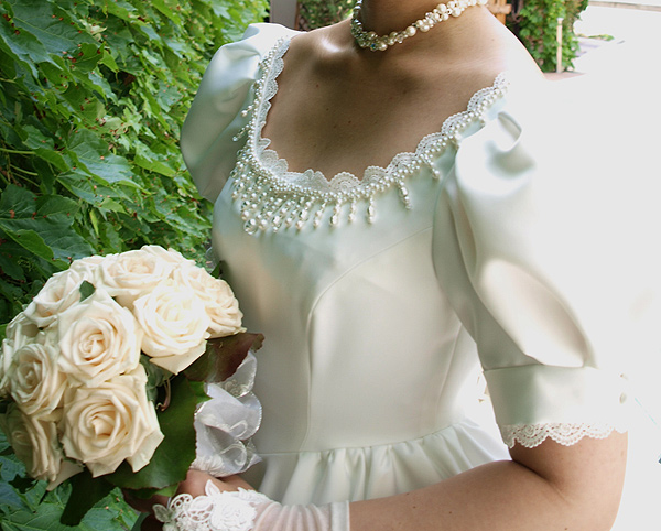 本場イタリアの手作りベネチアンビーズを胸元にあしらったウェディングドレス。